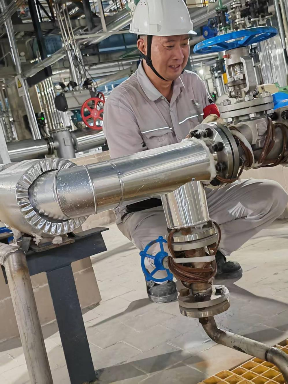 当最后一颗螺栓确认到位,两人才短暂退到阴凉处。脱下手套,掌心赫然是汗水泡透的褶皱与深红勒痕。尹庭焕一口气灌下半瓶盐水,工装早已湿透能拧出水。“早一小时确认安全,车间就能早一小时投料保供,”郭勇望着恢复待机状态的储罐,晒红的脸上终于露出笑意,“这汗,流得值!”