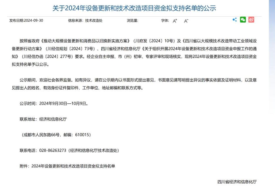 根据《关于组织开展2024年设备更新和技术改造项目资金申报工作的通知》(川经信办函〔2024〕277号)有关文件要求,能投德阿锂业公司进行了2024年设备更新和技术改造项目资金申报工作。该项资金是贯彻落实省委、省政府关于推动大规模设备更新和消费品以旧换新决策部署,重点支持工业和信息化领域的企业开展的生产产线整体升级改造、环保技改、安全生产技改等方向。