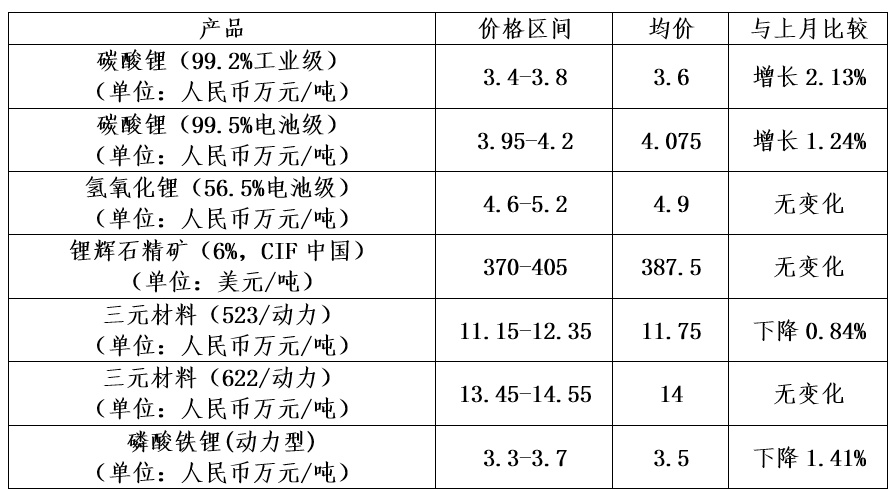 根据2020年10月22日报价数据,磷酸铁锂价格继上月小幅下跌后,本月继续下跌1.41%,523型三元材料价格本月下跌0.84%,锂精矿、氢氧化锂和622型三元材料价格月度环比无变化,碳酸锂价格出现小幅上涨。