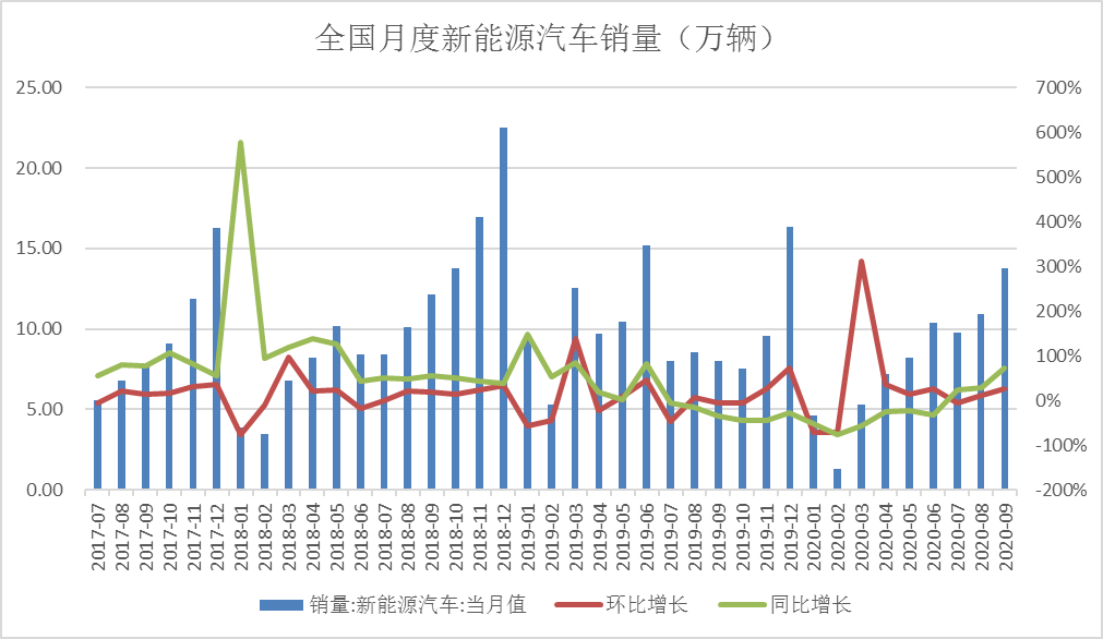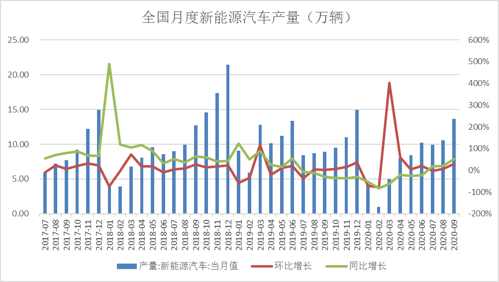 据Wind资讯统计,2020年9月全国新能源汽车产量13.61万辆,环比增长29%,同比增长53%。