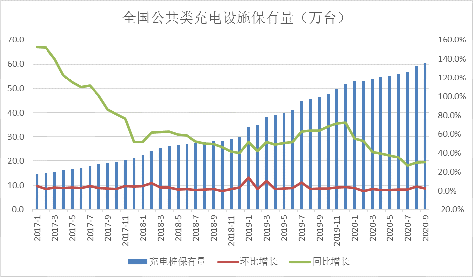 据中国电动汽车充电基础设施促进联盟统计,截至2020年9月全国公共类充电设施保有量为60.6万台,环比增长2.4%,同比增长30%,月度新增1.4万台。