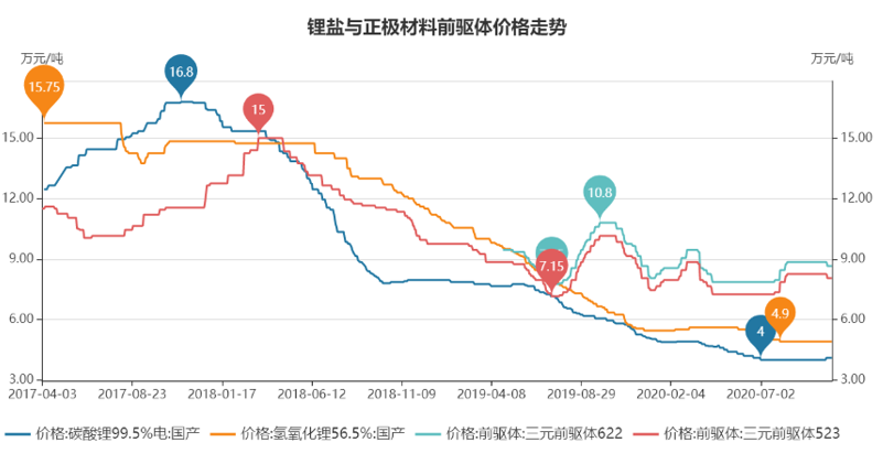 经过自2018年5月至2020年5月两年时间的调整,锂盐和正极材料前驱体的价格逐步趋于稳定,正极材料前驱体的价格连续两个月出现小幅回升后基本保持稳定,本月三元前驱体价格出现小幅回落,碳酸锂价格小幅上涨。10月22日,三元前驱体622最新报价8.65万元/吨,三元前驱体523最新报价8.05万元/吨,电池级碳酸锂价格4.1万元/吨。